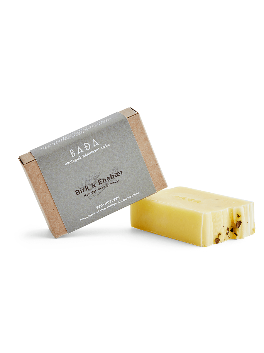 Håndlavet, økologisk og 100% vegetabilsk sæbe med en diskret duft af birk og enebær. Den plejende og skånsomme sæbe er mild mod huden og duften er inspireret af vikingetidens nordiske planter og urter.