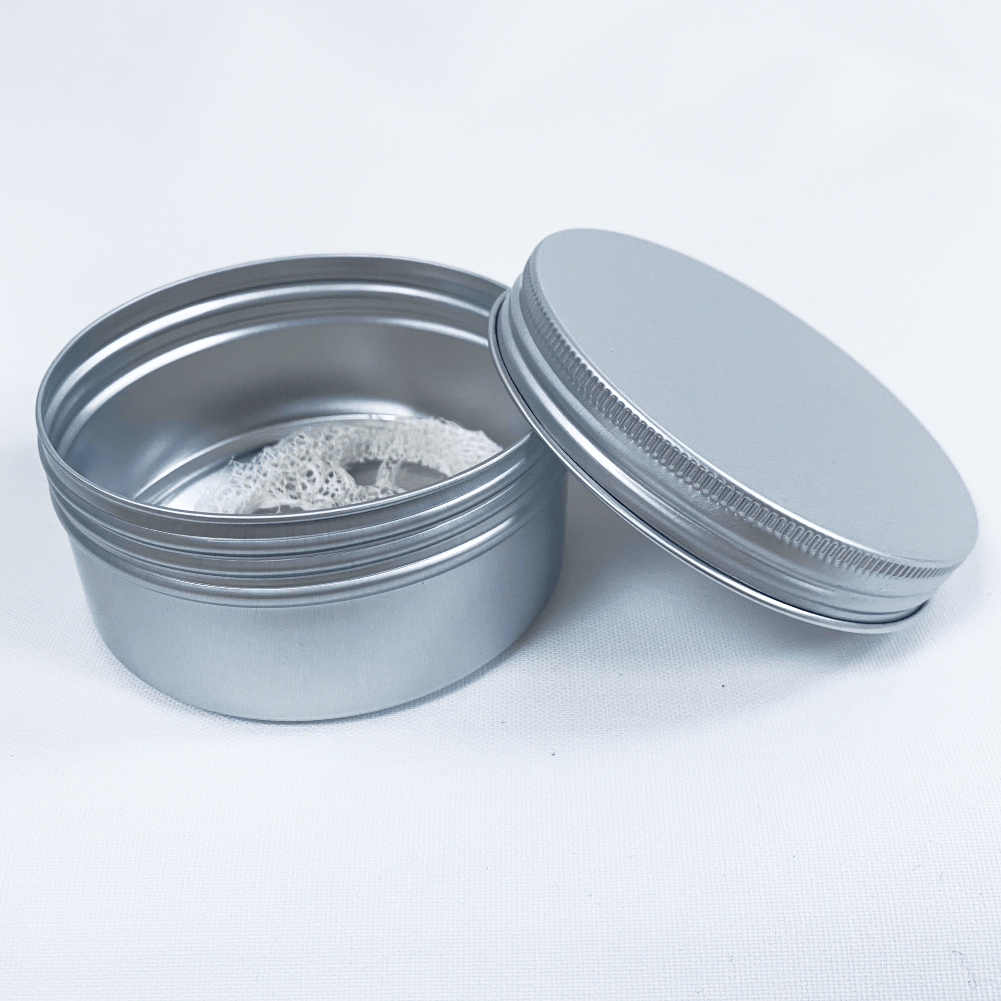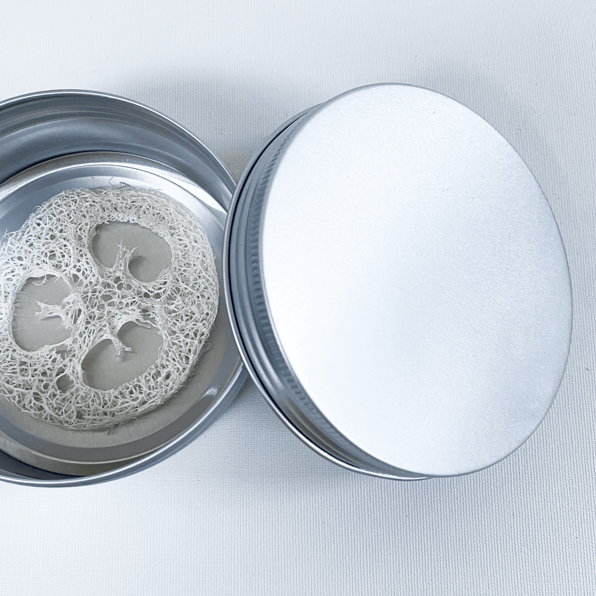 Loofahsvampen holder ca. et år og kan komposteres. Aluminiumsdåsen måler 90 mm i diameter og 45 mm i højden. Den kan rumme 250 ml.
