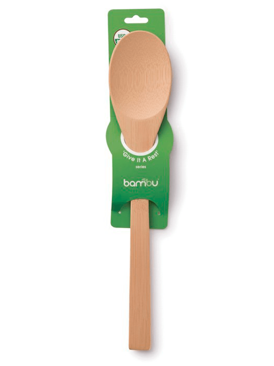 Hvor lægger man grydeskeen med sovs på? ‘Give-it-a-rest’ serien fra Bambu har løst problemet med den patenterede udskæring, der findes på bagsiden af skeen. Nu kan du lægge redskabet hvor du vil uden at få irriterende pletter på køkkenbordet.